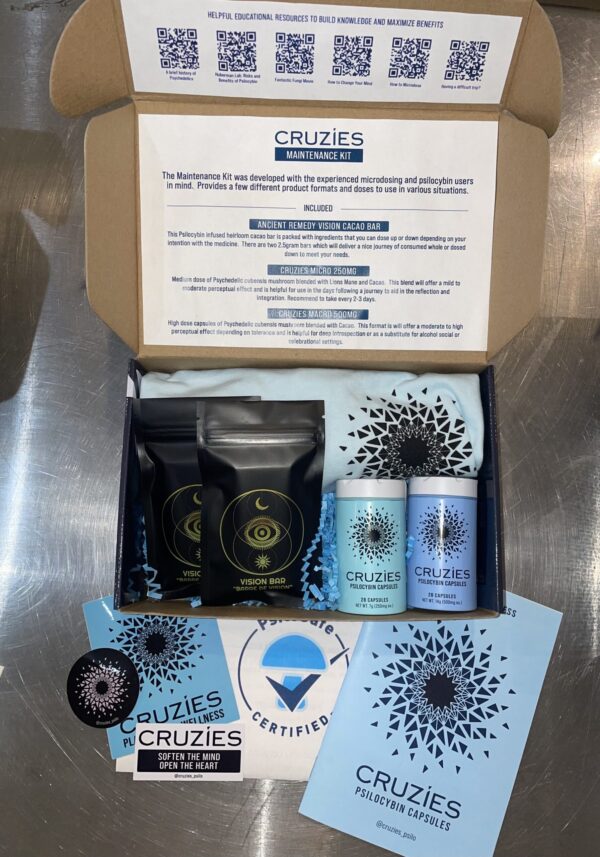 - Cruzies Micro 250mg – Moderate dose of cubensis (1/4 gram) per capsule with Lions Mane and Cacao